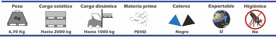 Palet de plástico. Encajable 1200 x 1000 x 160. Peso 6,70 kilogramos.